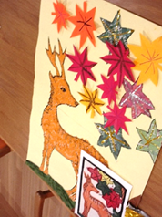 壁画は秋らしいものにしようと考え、花札の「紅葉に鹿」を折り紙やお花紙を使ってみんなで作成しました。