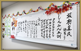 会議室の真っ白な壁全体を使って皆さんの素敵な作品をどのように飾ろうか…🤔大変悩みましたが、色紙で作った紅葉や輪飾り、海水浴場で拾った松ぼっくりなどを使い秋らしい装飾を施すと…あら、ステキ💕