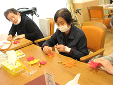 壁画は秋らしいものにしようと考え、花札の「紅葉に鹿」を折り紙やお花紙を使ってみんなで作成しました。